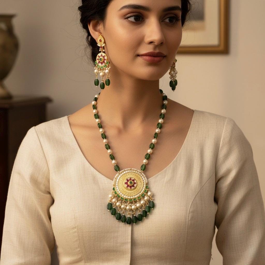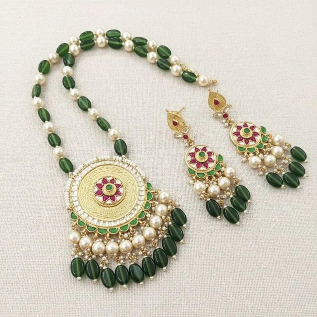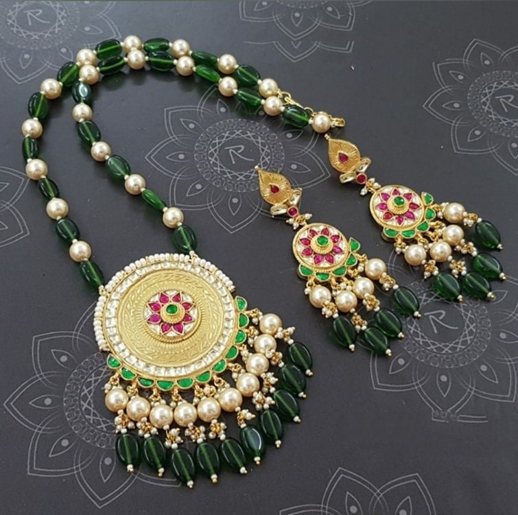 • It’s beautiful Ethnic Indian Kundan Pendant necklace with Statement Earrings and beaded with Green hangins and Pearls.Its also Threaded with Beautiful Pearls Strings and Threads like shown in picture.