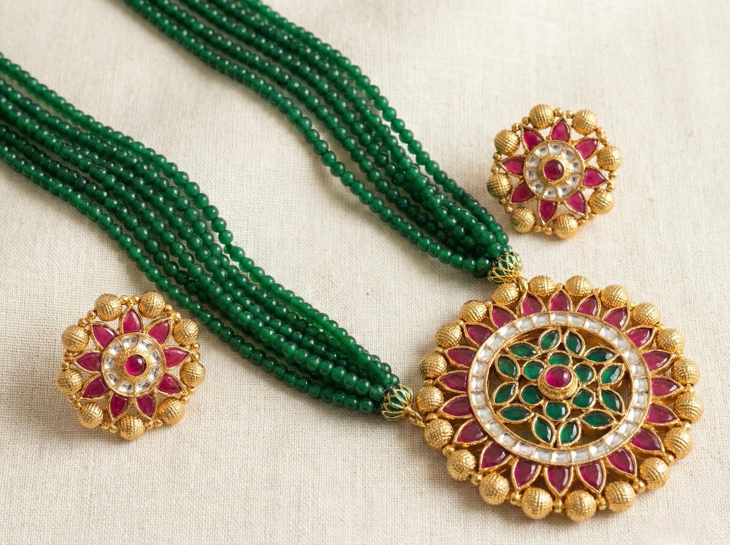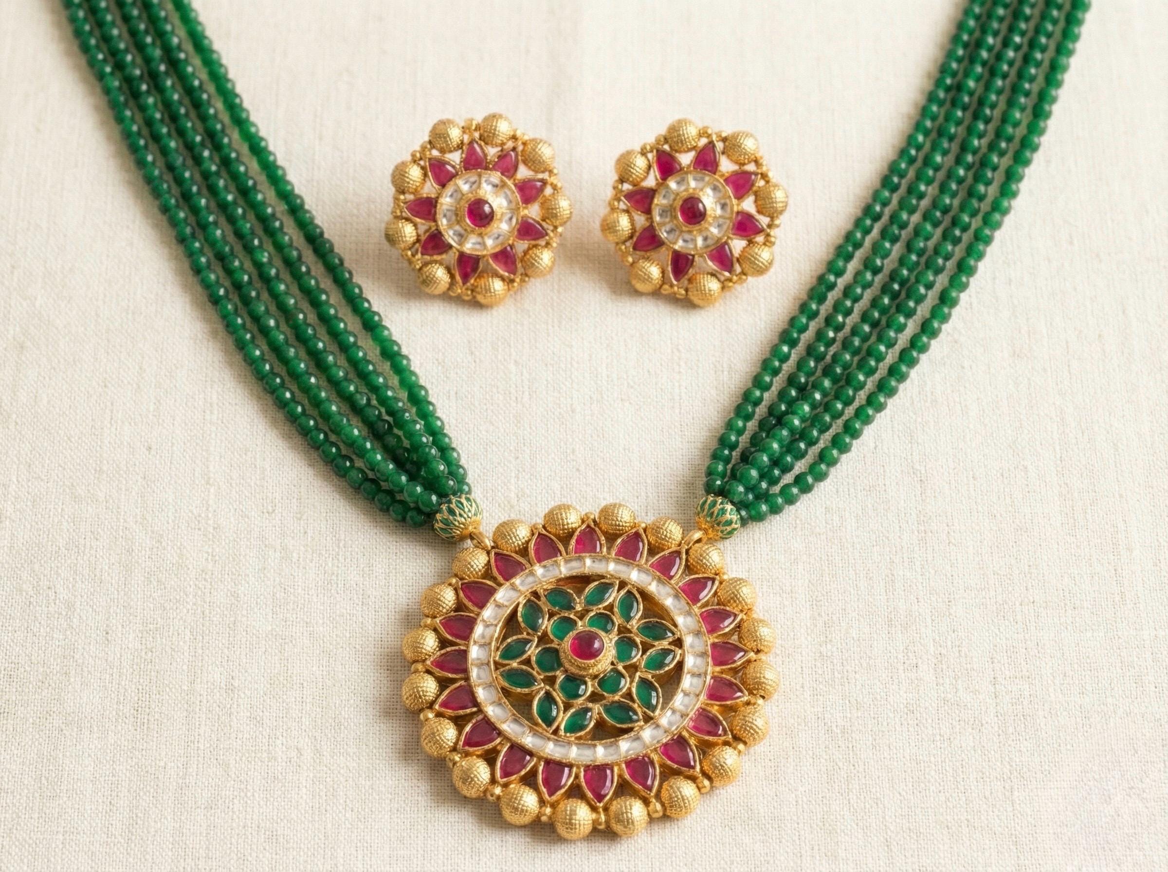 Its 22k Gold Finish Handmade Kundan Jewelry Pendant Necklace with Pink and Green Stringing and Golden Balls.