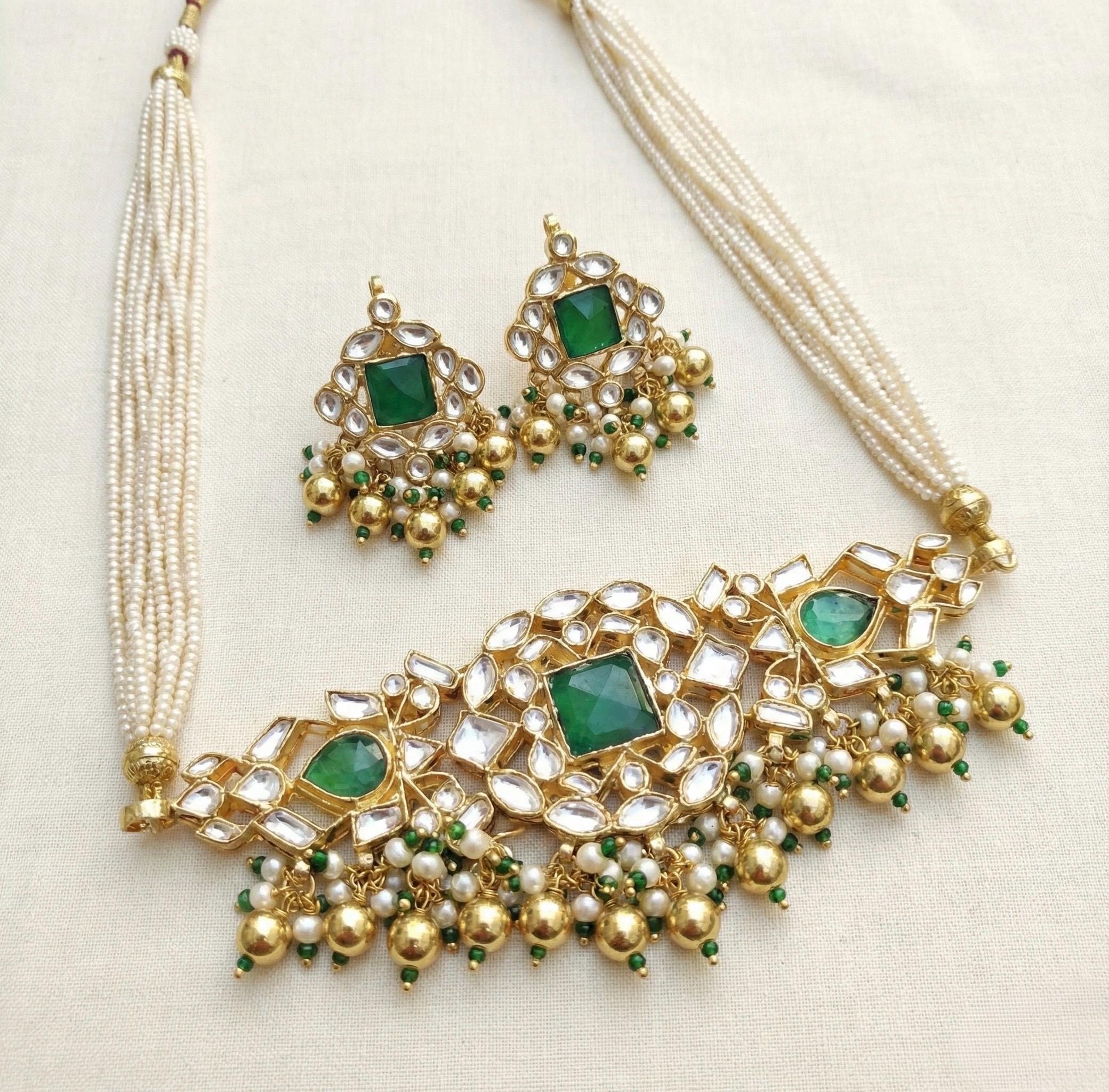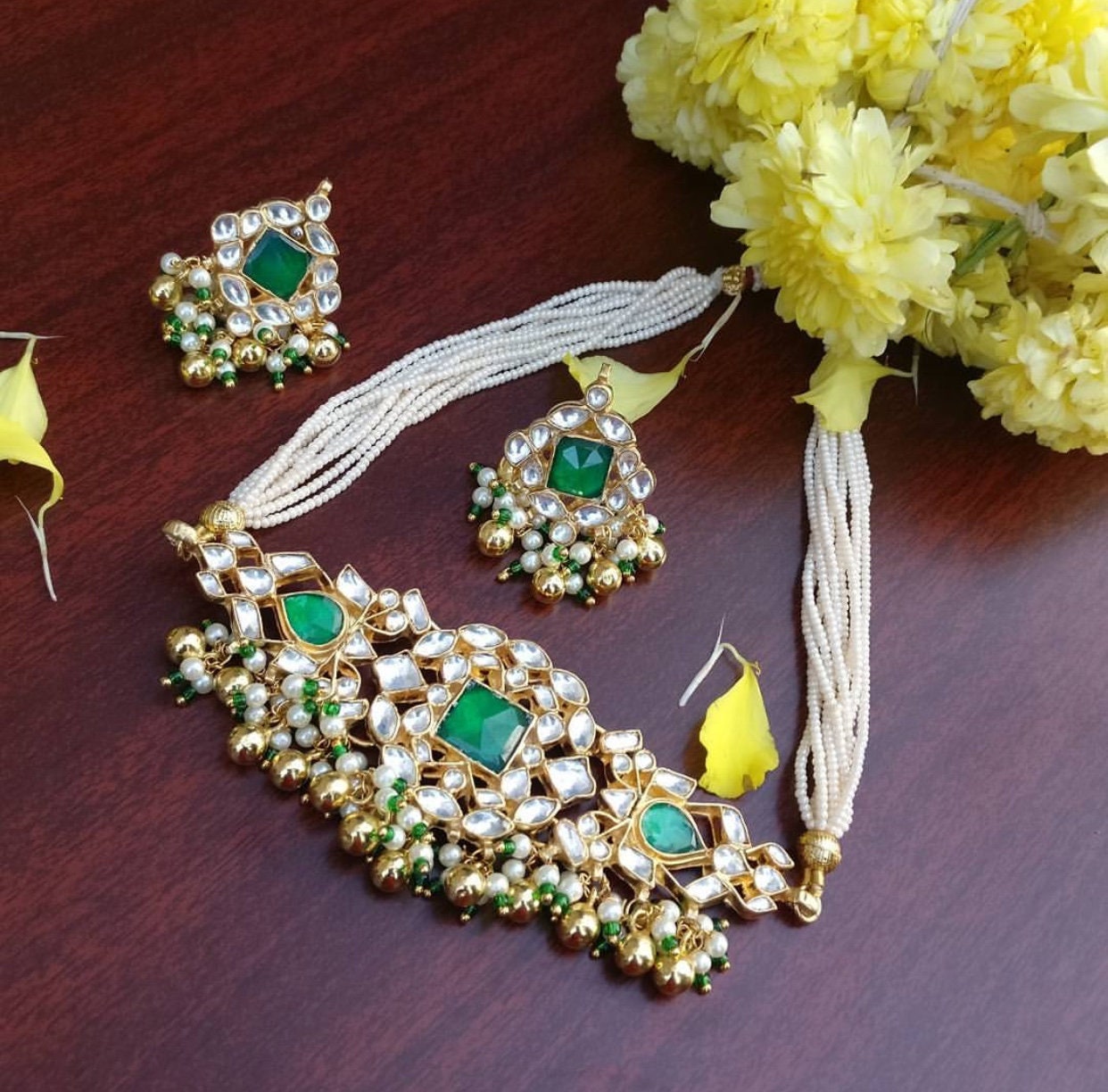 • It is a beautiful Ethnic Indian White and Green Kundan Wedding Choker with Statement Earrings.