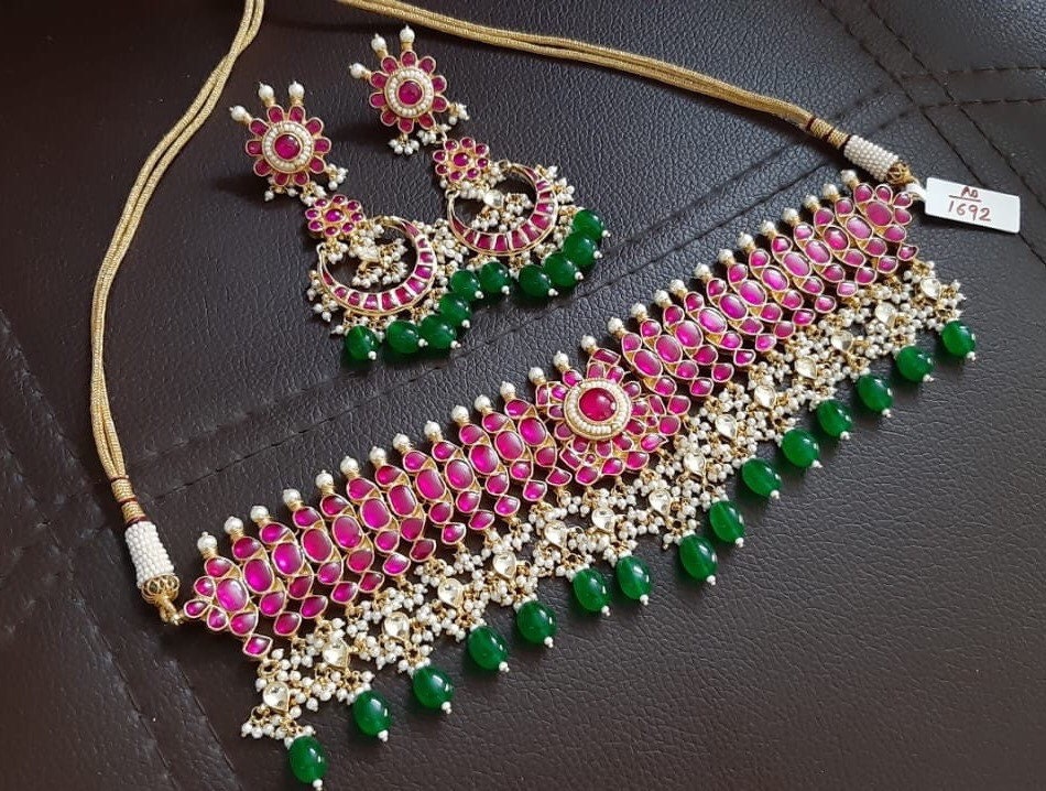 • It is Handmade Gold Plated Indian Kundan Jewelry Choker Necklace and Earrings Set with Pink and Green Stone Combination.