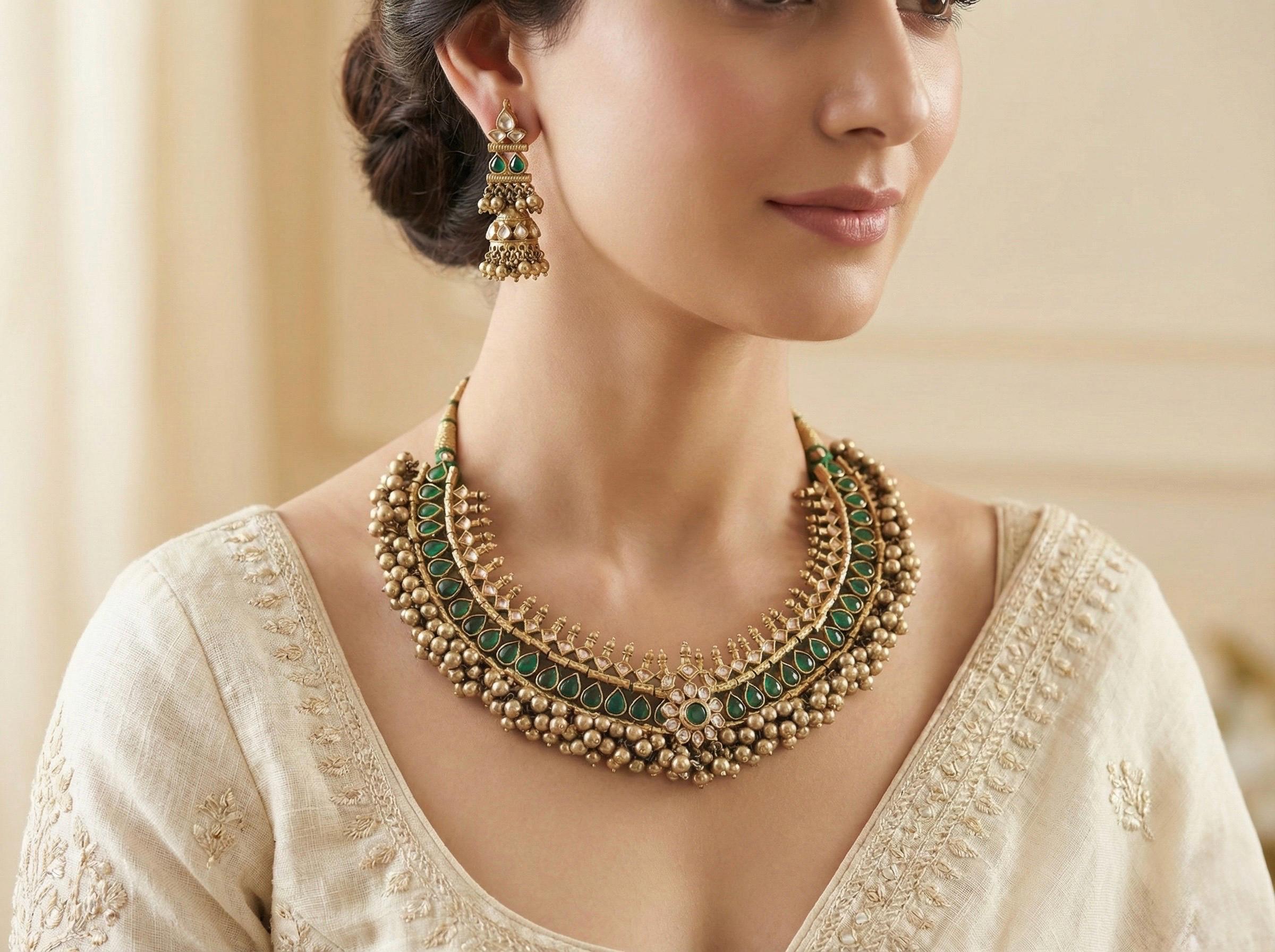 A timeless bridal masterpiece handcrafted in traditional Maharashtrian and South Indian Kundan artistry.
