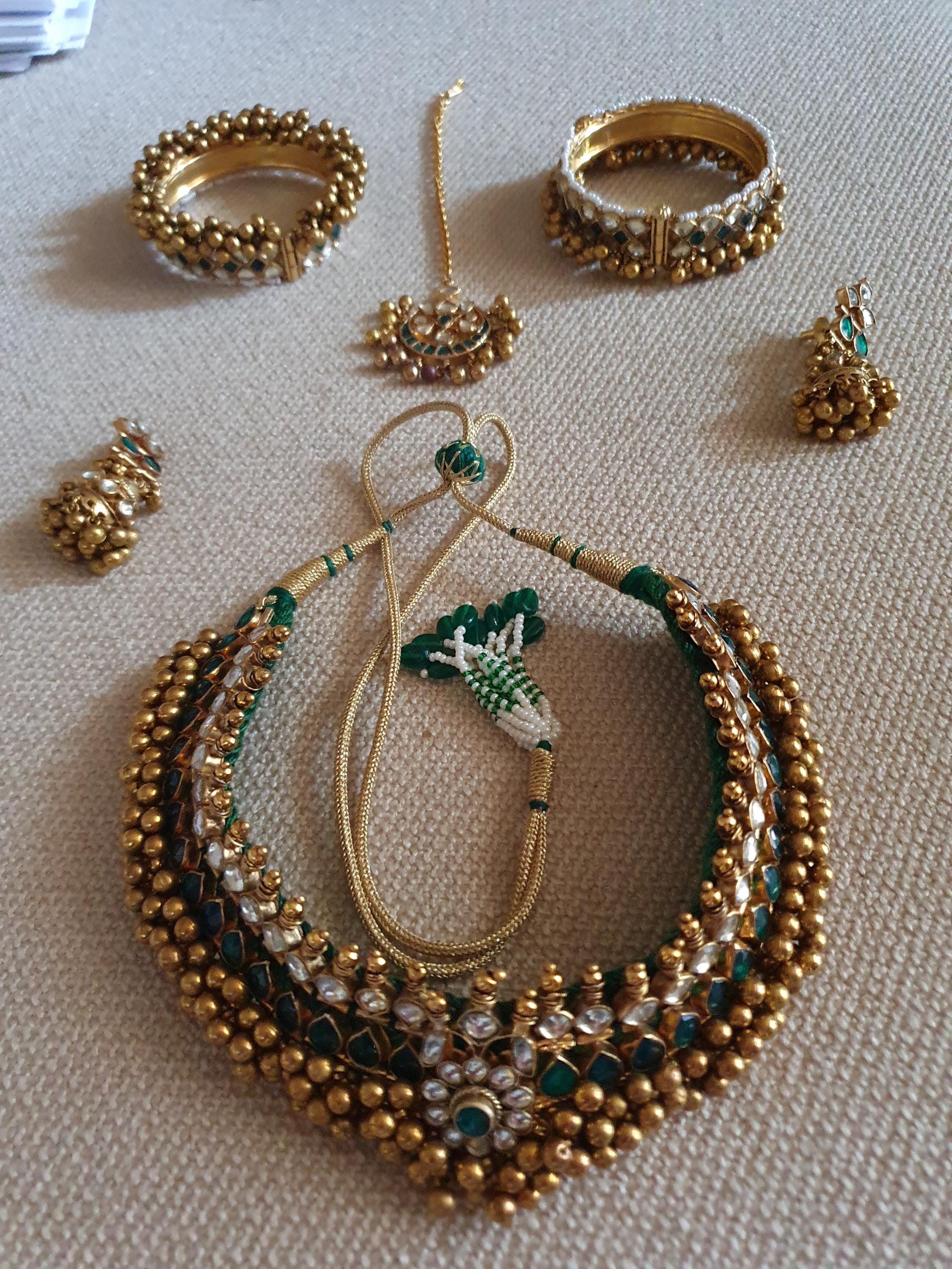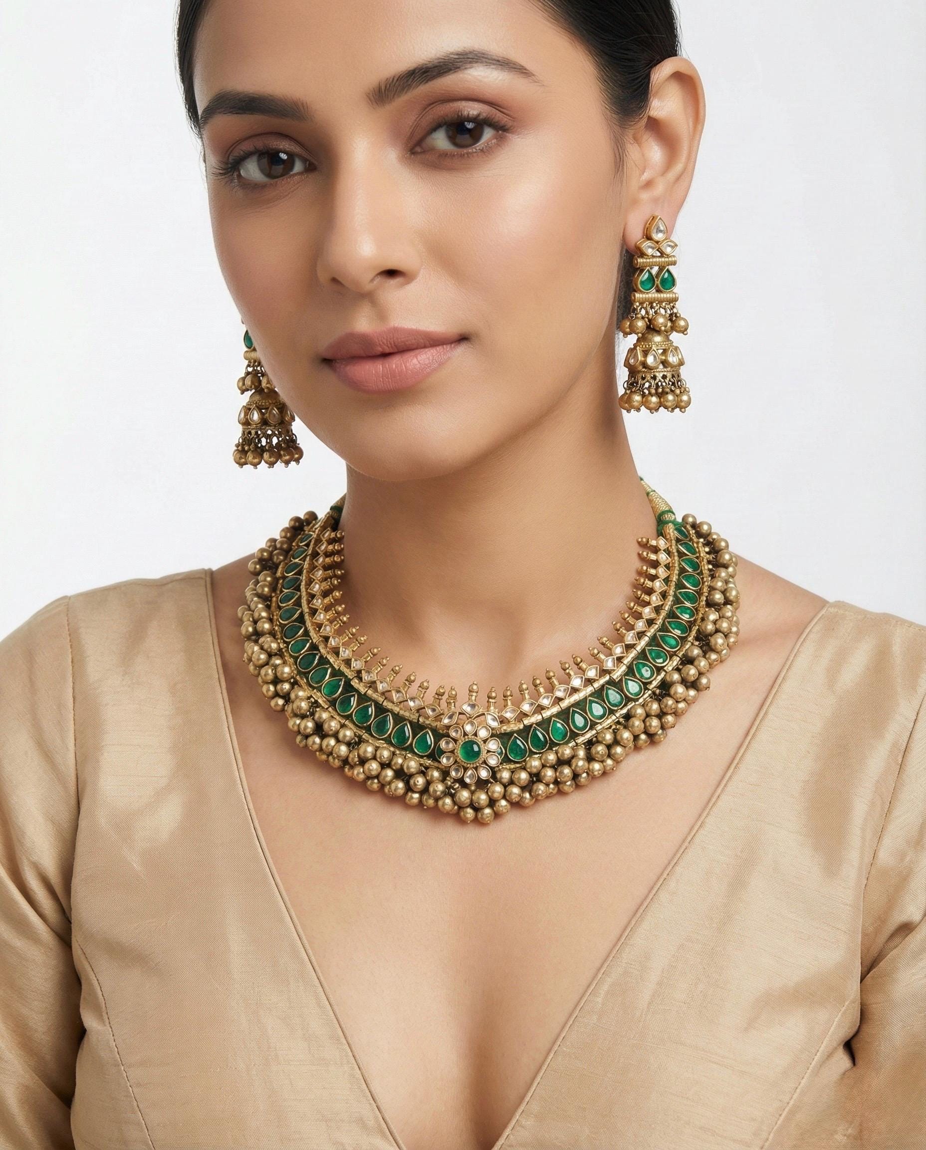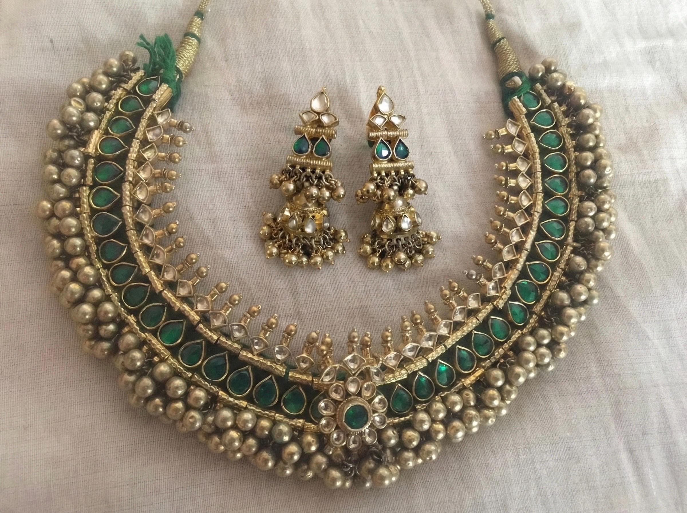 • South Indian Green Tussi Antique Gold Finish Indian Kundan Jewelry Necklace and Earrings Set.