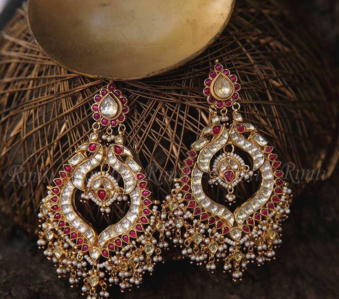 Antique Gold Finish Silver Kundan Bridal Jewelry Chandbali Earrings for Indian and Pakistani Brides for all Occasions.