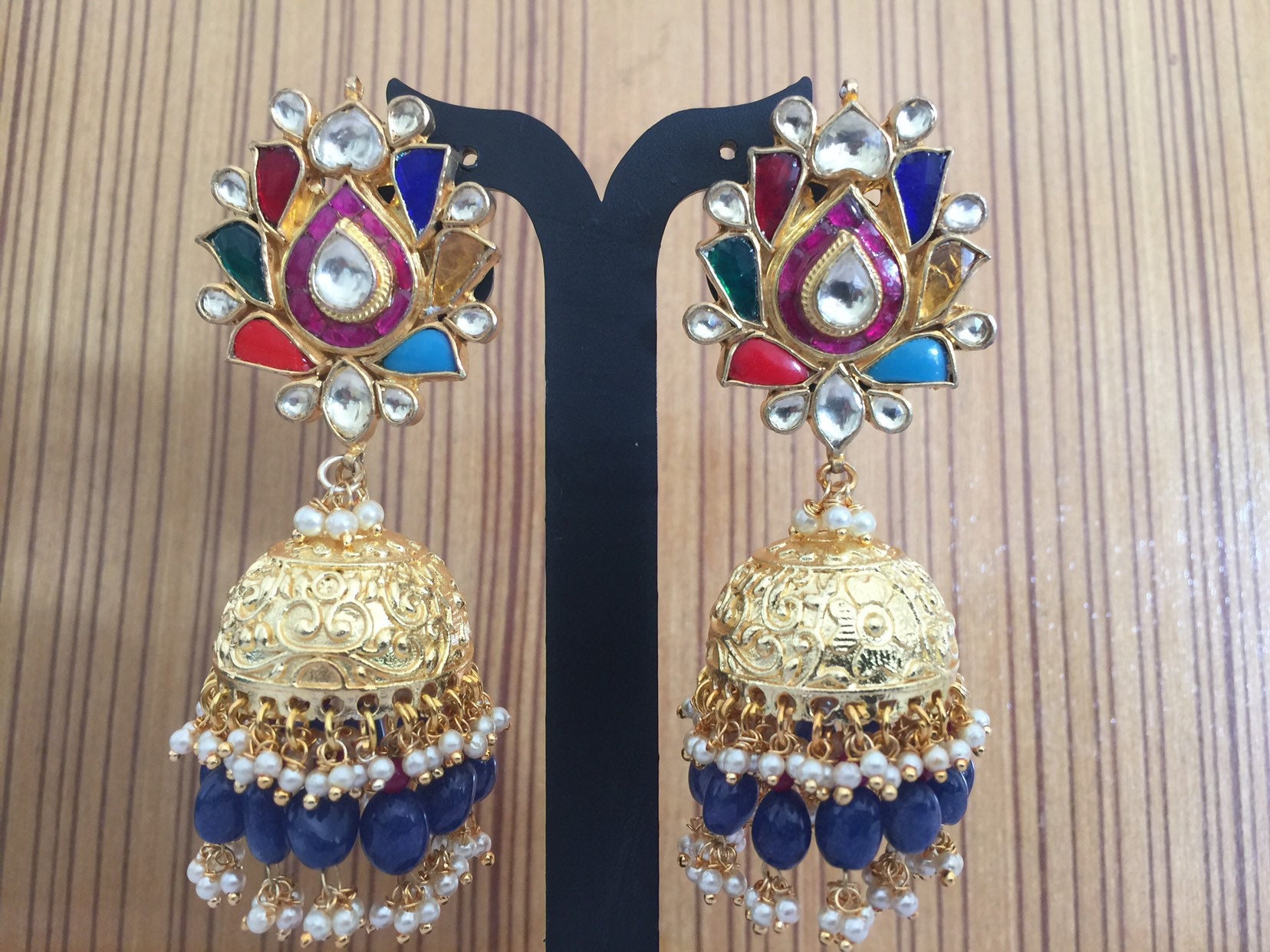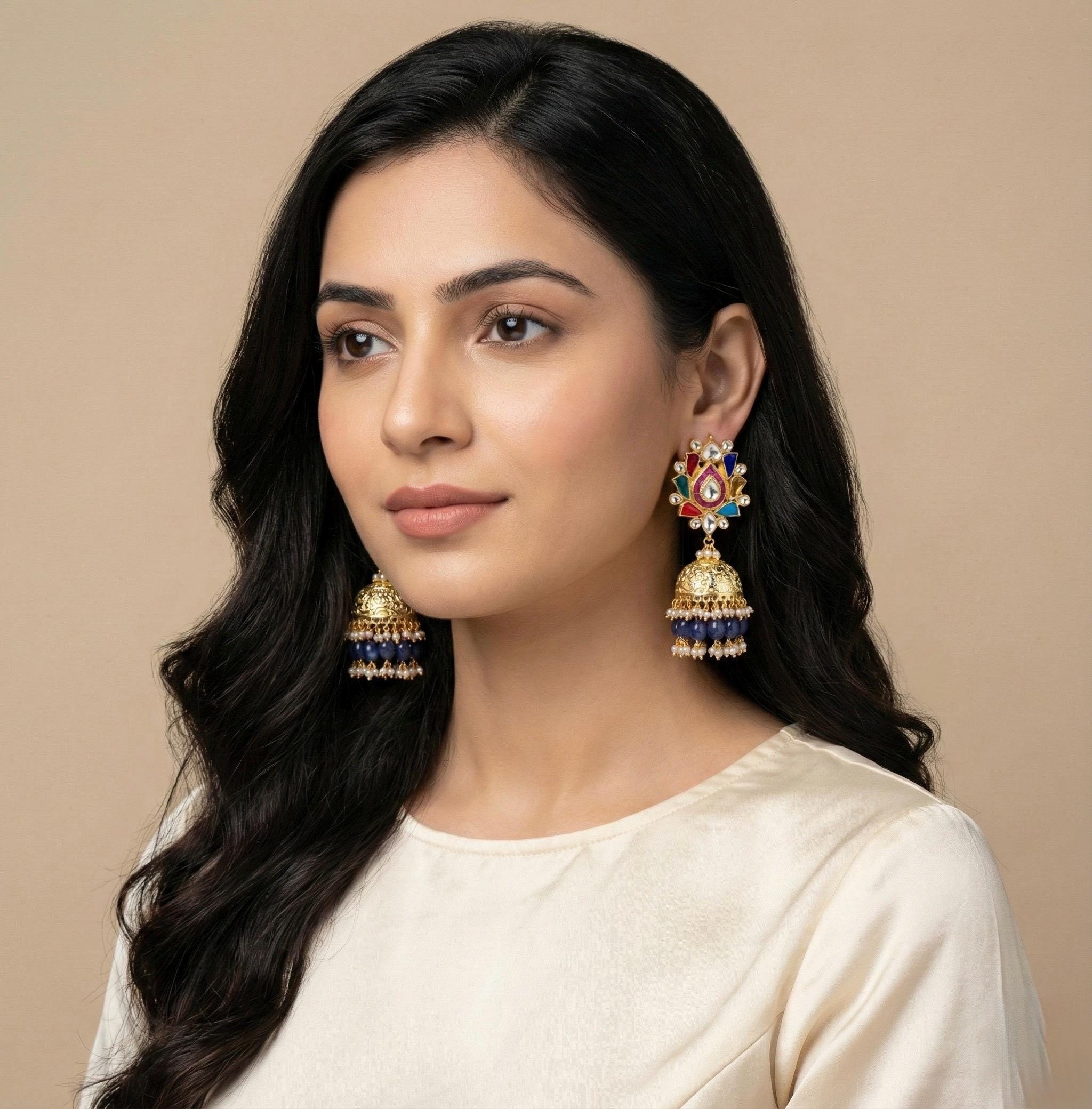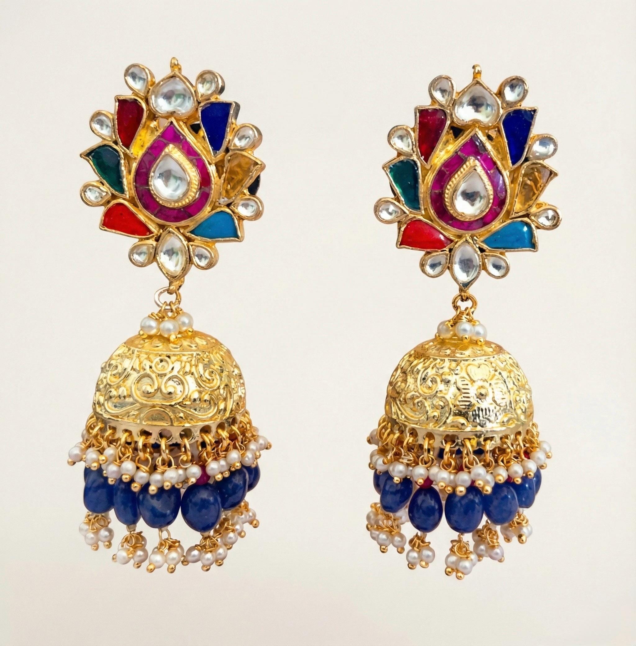 • Indian Ethnic Navratna Kundan Earrings with Jumkhi with antique gold finish.