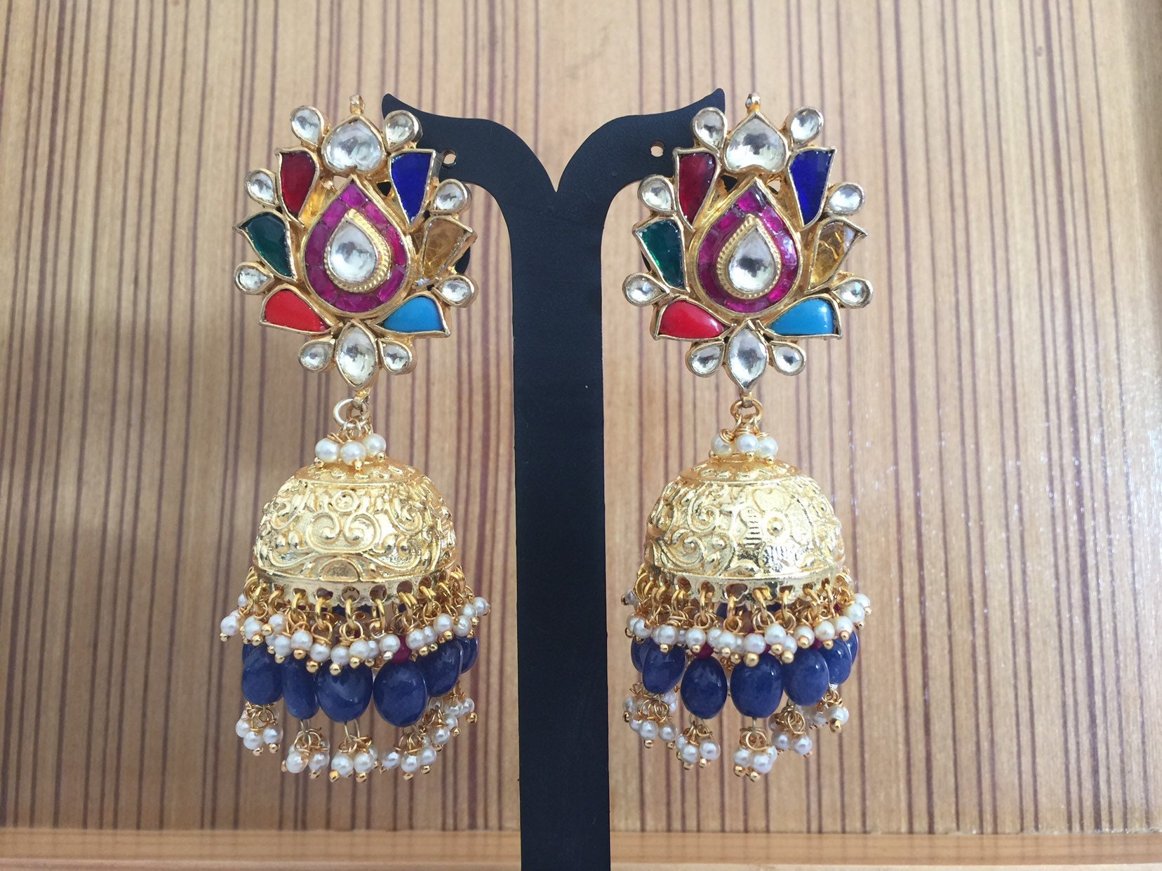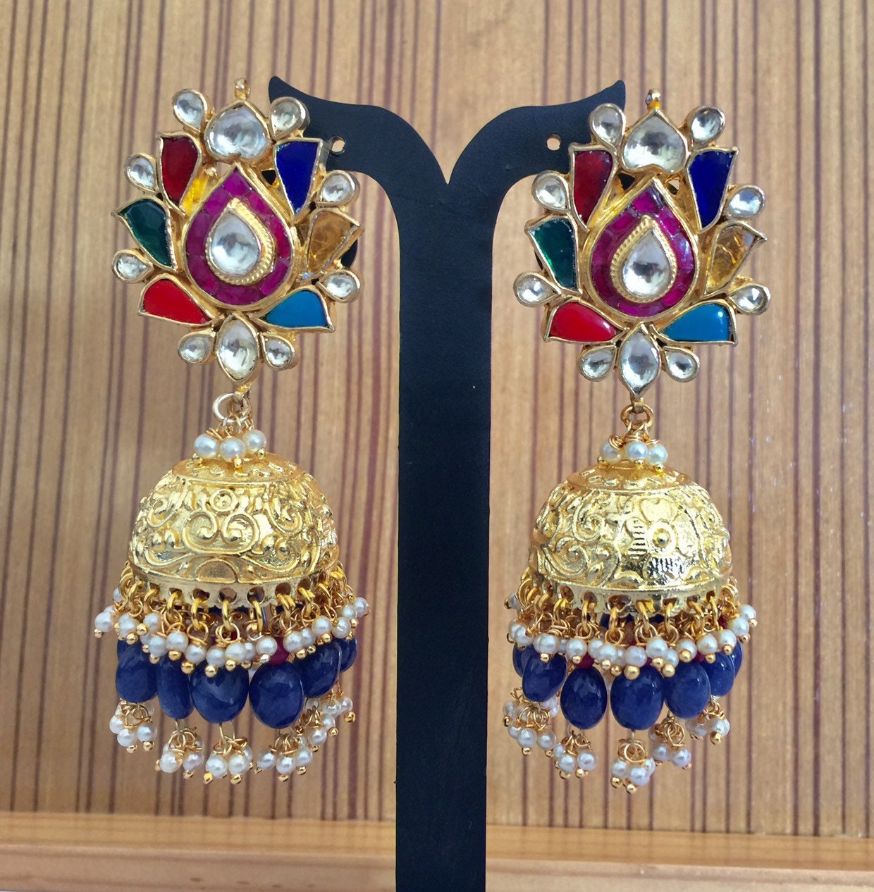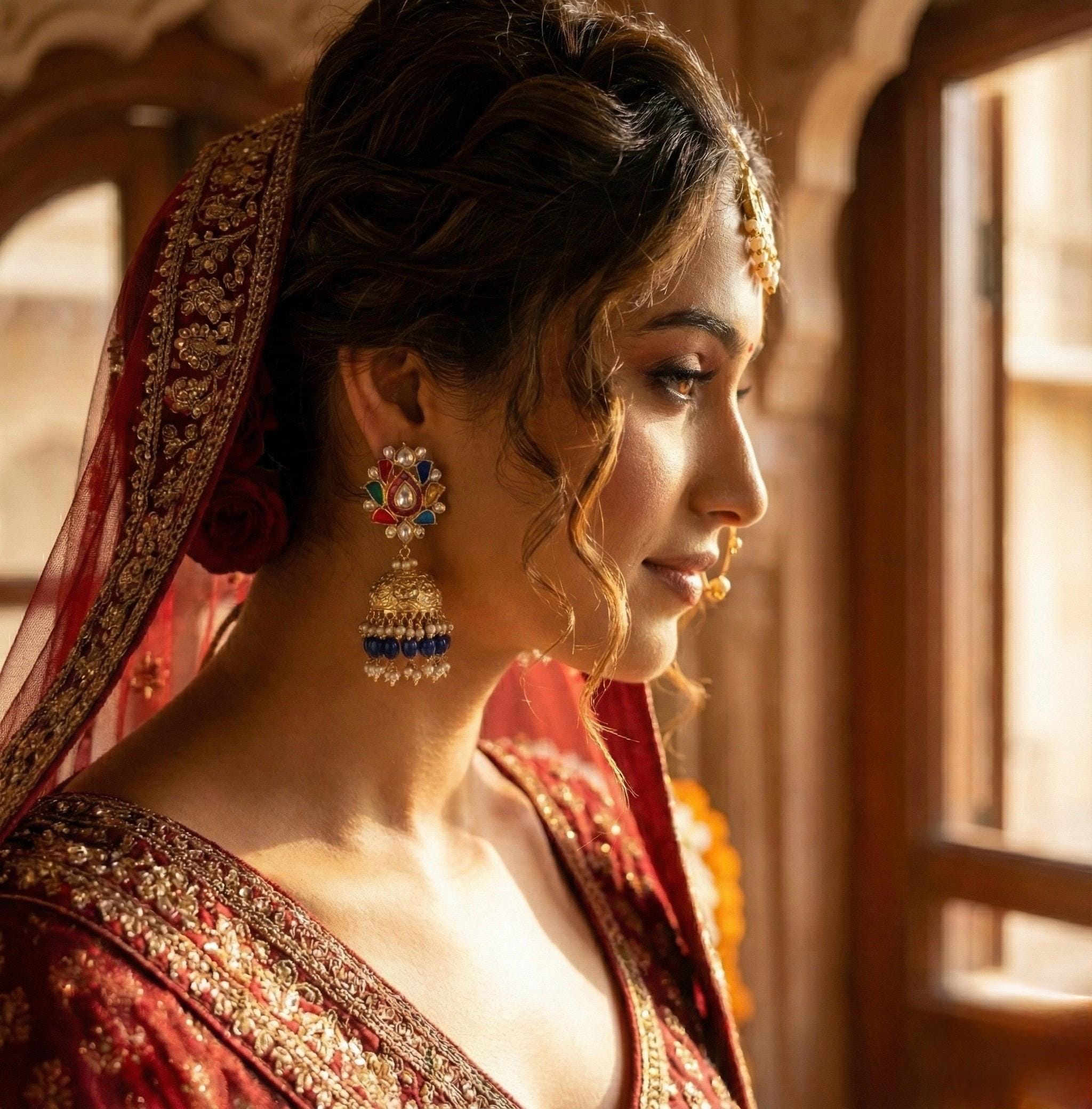 • Indian Ethnic Navratna Kundan Earrings with Jumkhi with antique gold finish.