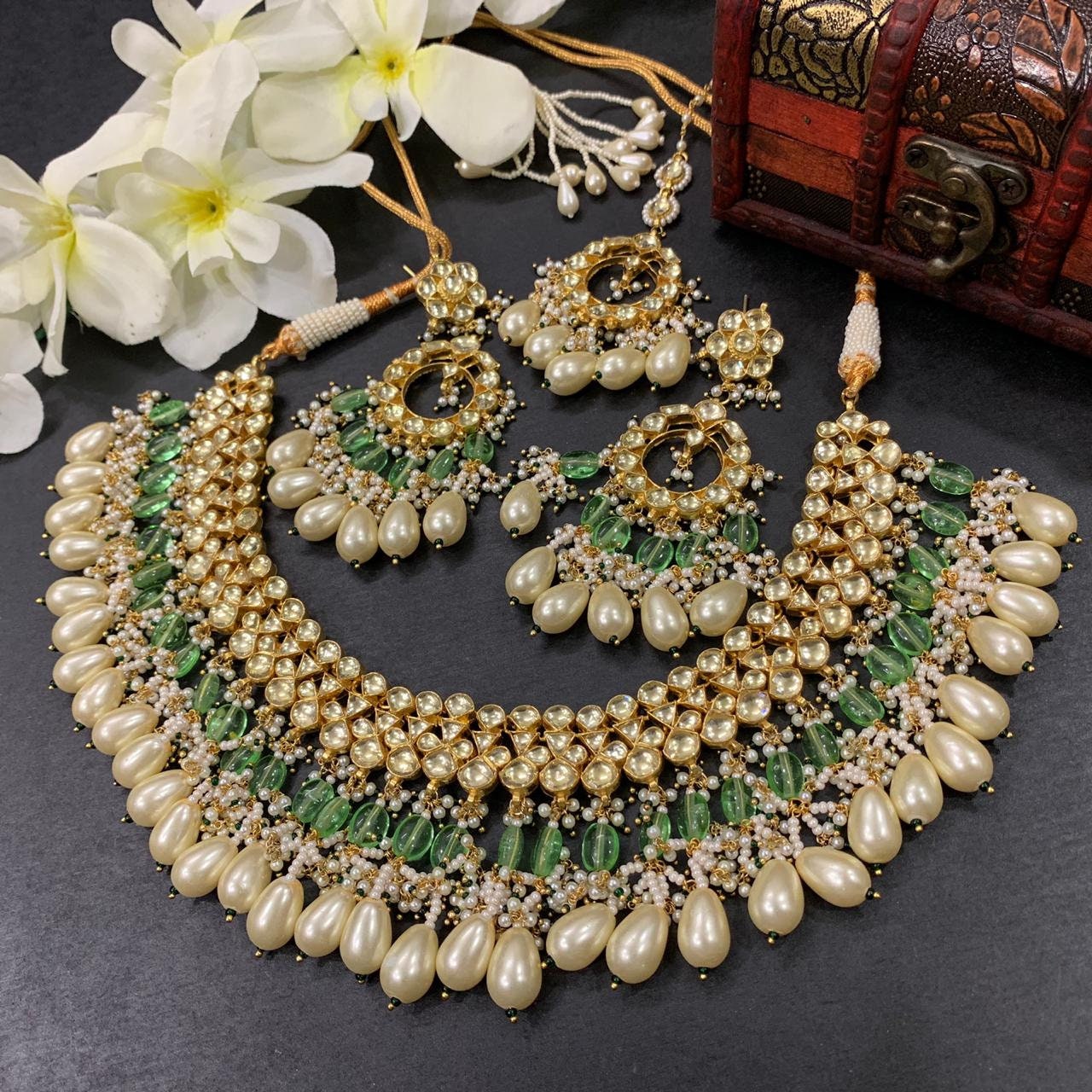 Sabyasachi Inspired Indian Kundan Jewelry Set with Green and Gold Color Combination.