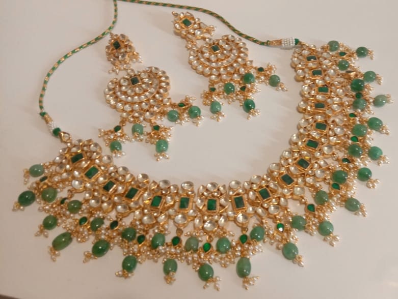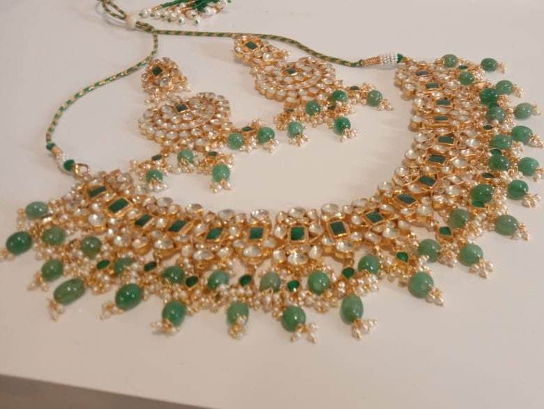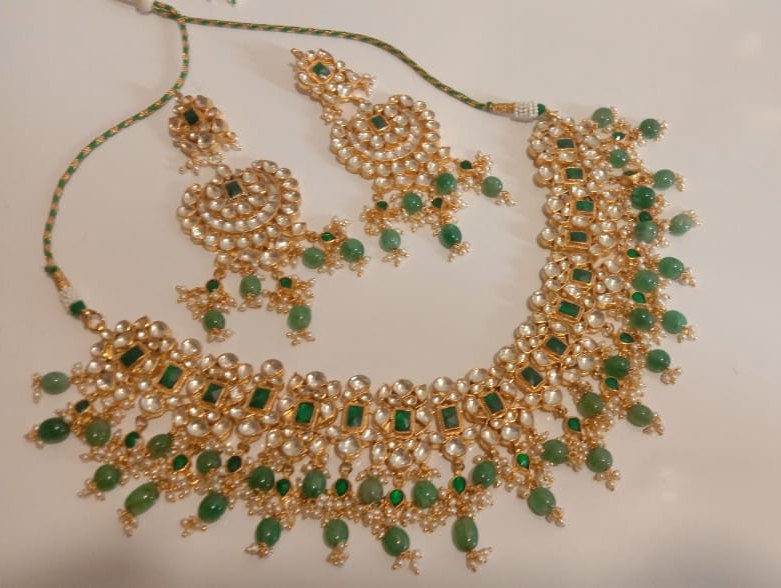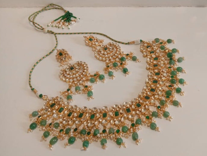 • Handcrafted Indian Kundan Jewelry Necklace and Earrings Set with matching maangtikka.