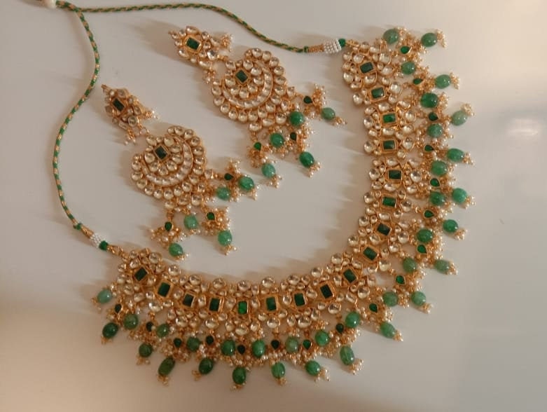 This Kundan choker necklace paired with elegant chandbali earrings features rich green accents, creating a stunning piece of Indian bridal jewelry perfect for weddings and festive occasions