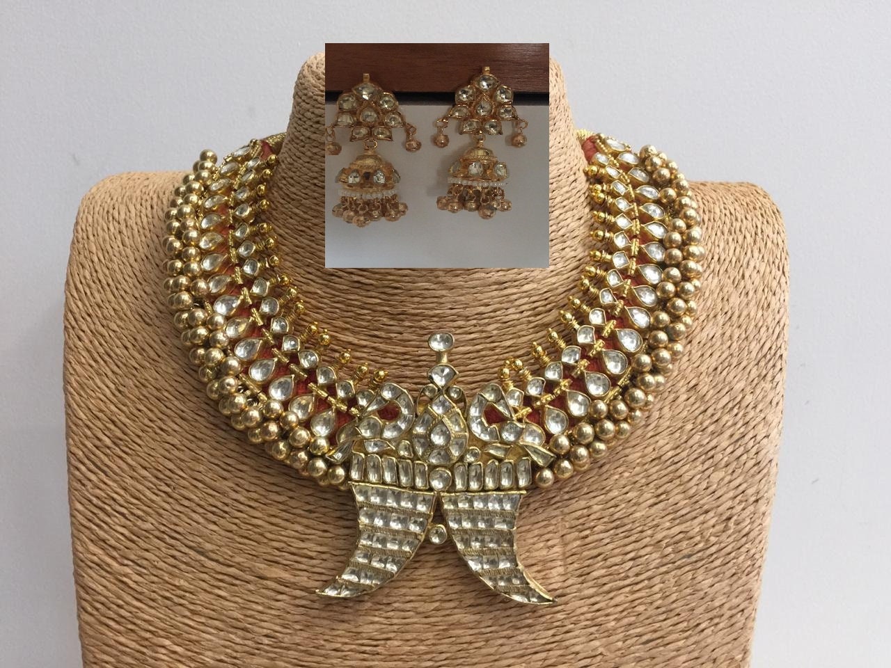 • It’s Gold Plated Indian Kundan Jewelry Tussi Necklace and Earrings Set.