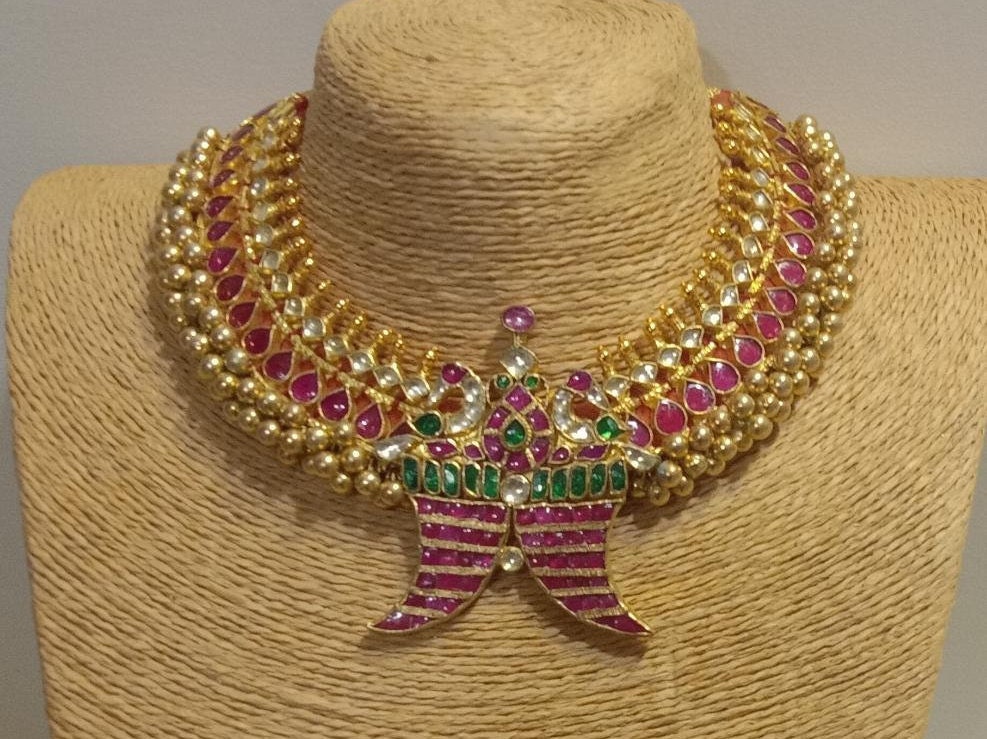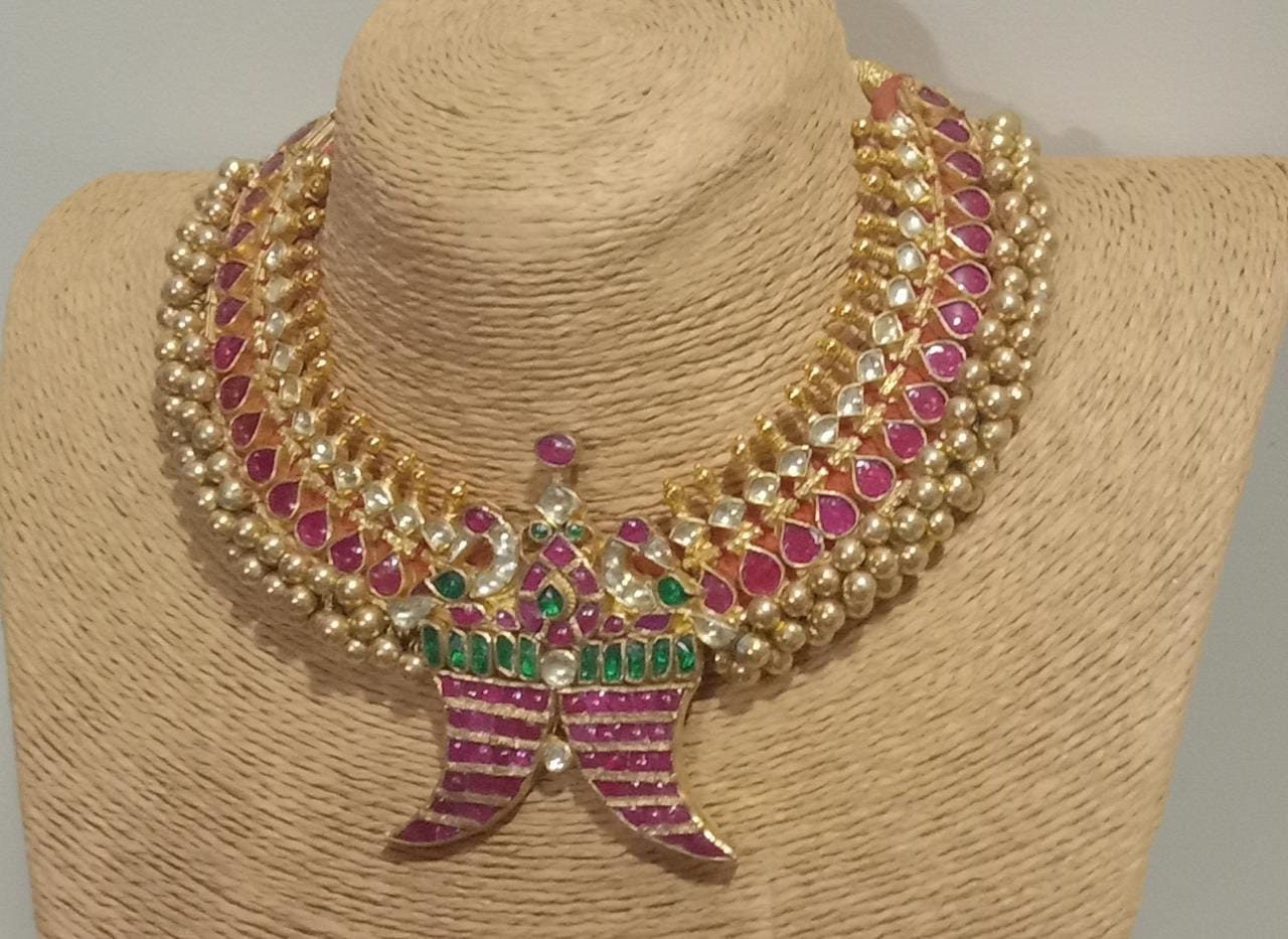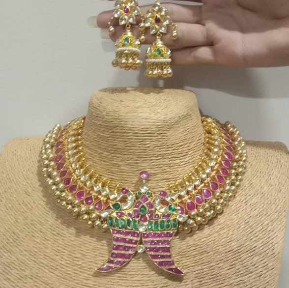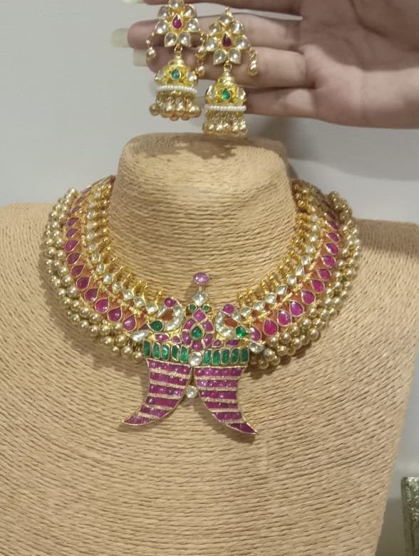 • It’s beautiful Ethnic South Indian Pink and Green Kundan Wedding Choker with Jumkhi Earrings.