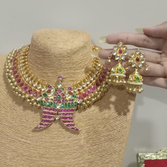 • Gold Finished South Indian Kundan Tussi Necklace and Jumkhi Earrings Set.